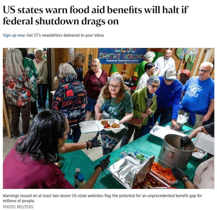 中新網(wǎng)10月27日電 綜合美媒報道,美國農(nóng)業(yè)部在其網(wǎng)站上發(fā)布通知稱,聯(lián)邦食品救濟將于11月1日停止發(fā)放。