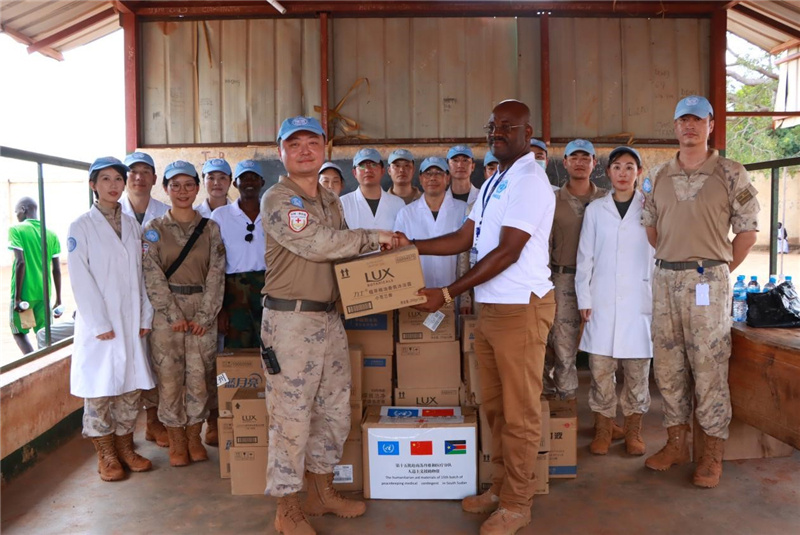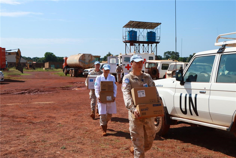 中國維和醫(yī)療分隊向當(dāng)?shù)鼐栀涐t(yī)療物資。魯振輝攝