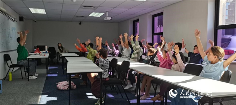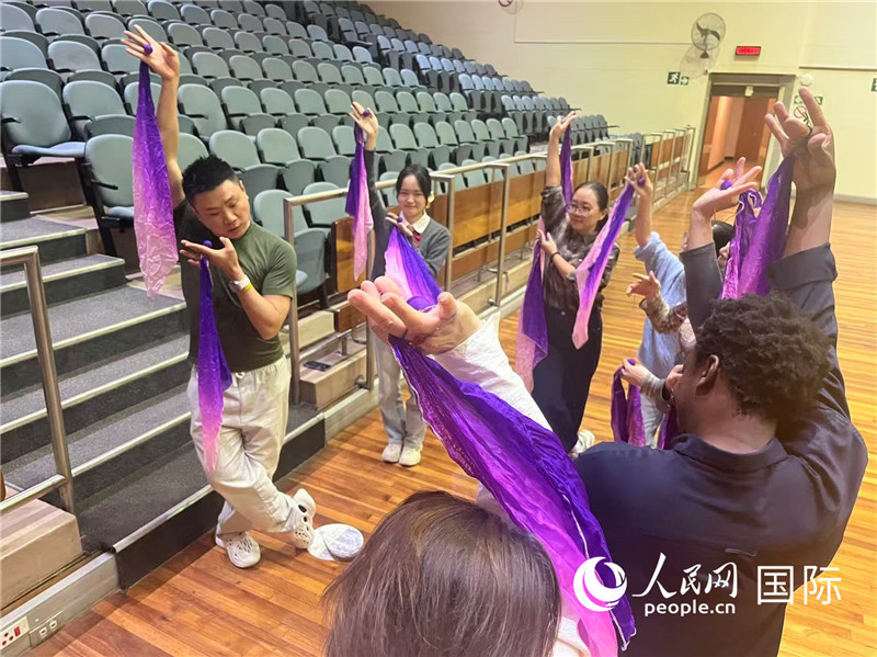 林晟昱老師在西開普大學中醫(yī)孔子學院向當?shù)貛熒鷤魇谘砀琛霸E竅”。人民網(wǎng)記者 鄒松攝