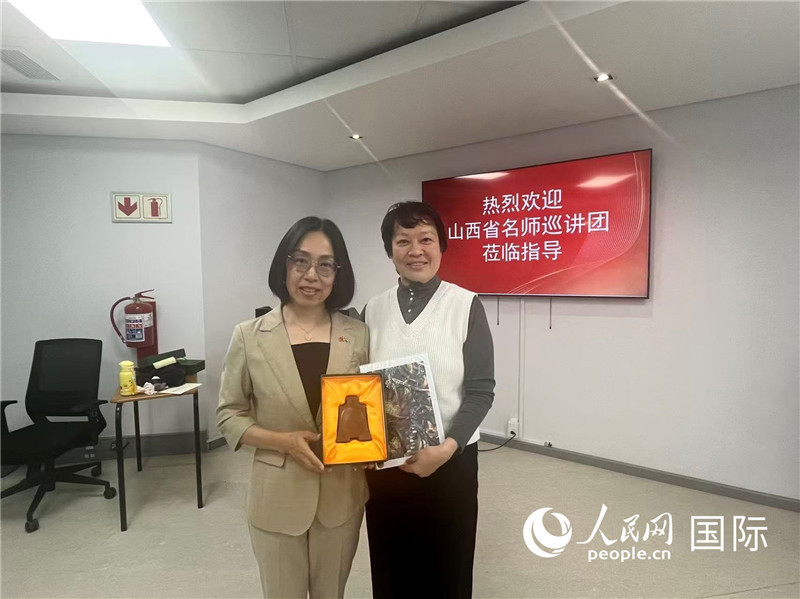 山西省名師巡講團與西開普大學中醫(yī)孔子學院互贈紀念品。人民網(wǎng) 董嘉怡攝