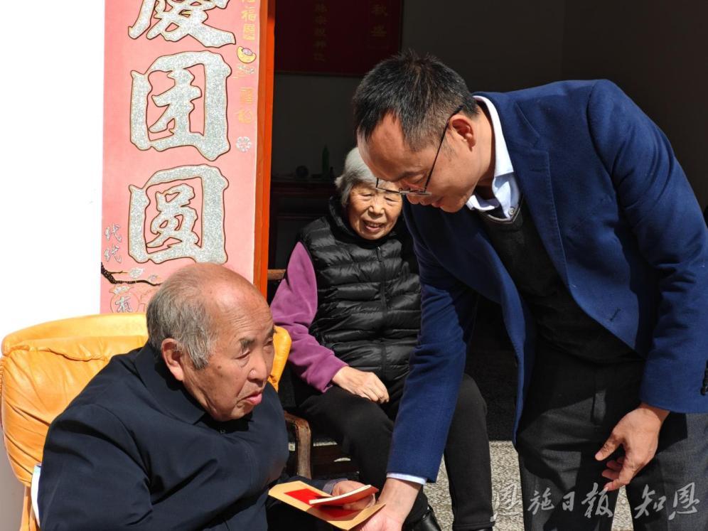 在建始縣第一任審計(jì)局長(zhǎng)何光碧家中,現(xiàn)任局長(zhǎng)郭孝波與95歲高齡的老人促膝而談,詳細(xì)詢問他的身體狀況、生活情況,細(xì)心了解老人在生活上是否存在需要組織幫助解決的困難,耐心傾聽老人的心聲,并回憶往昔工作的故事。