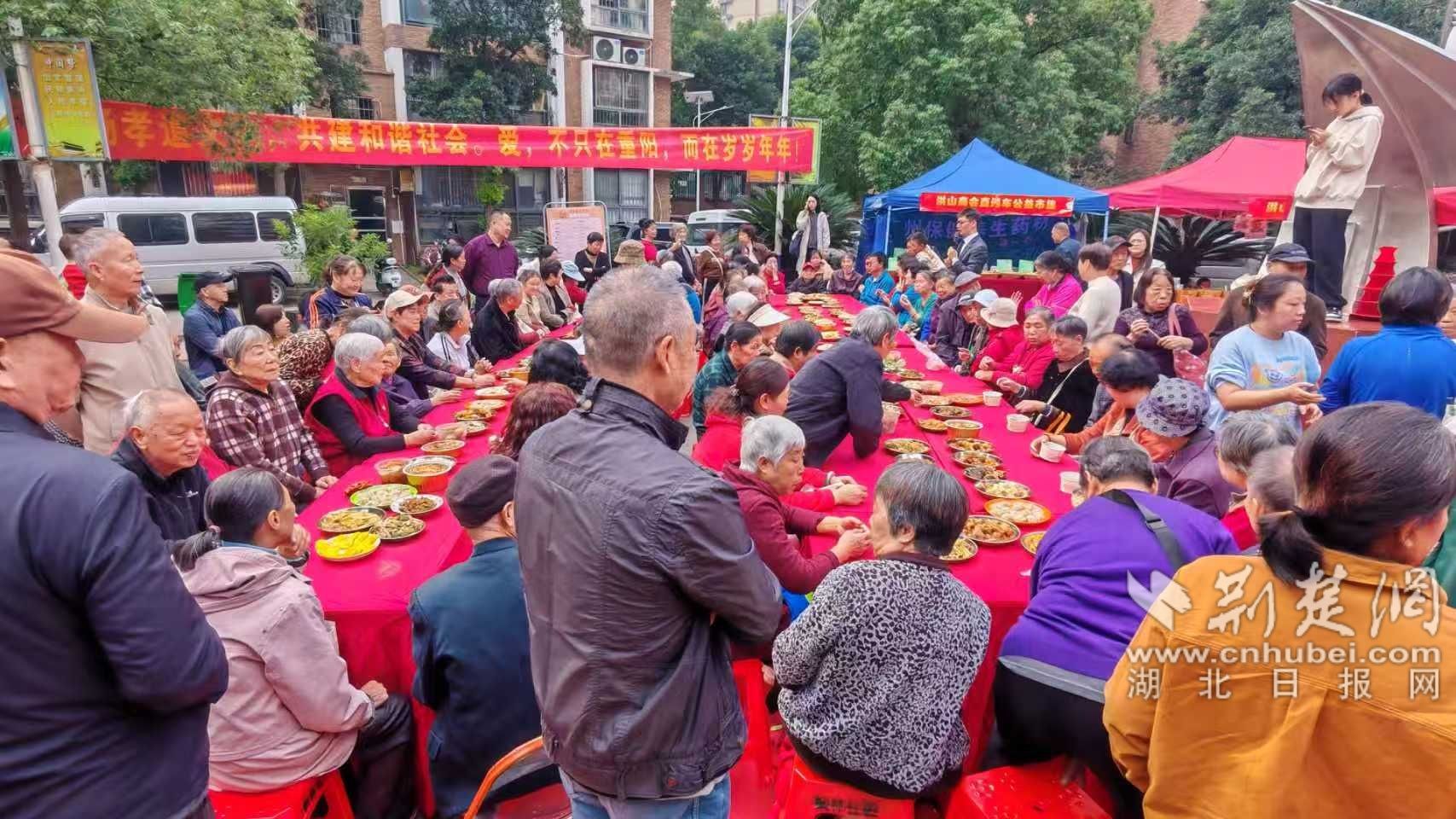 匯演落幕,備受期待的百家宴正式開席。社區(qū)精心籌備的100余道佳肴擺滿餐桌,葷素搭配合理、營養(yǎng)均衡豐富,既有軟糯香甜的傳統(tǒng)糕點,也有鮮香入味的熱菜小炒,更有清爽解膩的時令瓜果,香氣撲鼻惹人垂涎。老人們圍坐一堂,邊細(xì)品美食邊拉家常、話趣事,鄰里間你謙我讓、其樂融融,一幅“社區(qū)一家親”的溫馨畫卷。黨員志愿者們穿梭席間,主動為行動不便的老人添菜倒湯,貼心詢問飲食偏好與身體狀況,細(xì)致周到的服務(wù)讓現(xiàn)場暖意更濃、溫情倍增。