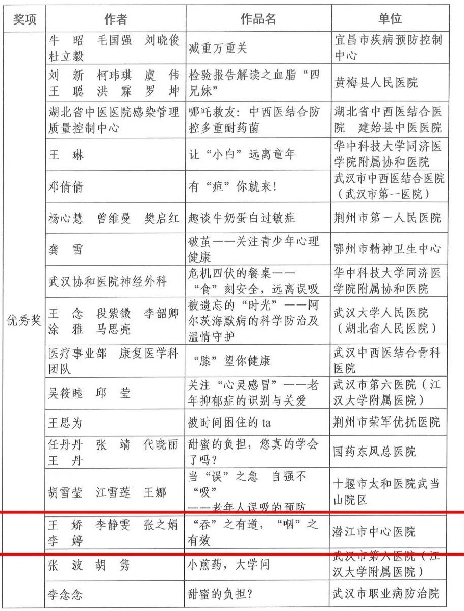 近日,湖北省衛(wèi)生健康委員會等六部門聯(lián)合印發(fā)《關(guān)于2025年度湖北省健康科普作品征集活動獲獎情況的通報(bào)》,潛江市中心醫(yī)院選送的兩項(xiàng)作品《別讓糖尿病蒙蔽了你的雙眼》和《“吞”之有道,“咽”之有效》,在全省3082件參賽作品中脫穎而出,雙雙榮獲省級健康科普作品優(yōu)秀獎。