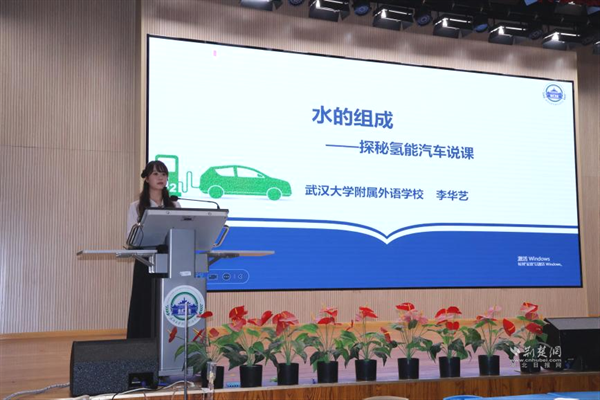 武漢大學(xué)附屬外語學(xué)校李華藝?yán)蠋焾?zhí)教《水的組成——探秘氫能汽車》展示課。課程以新能源汽車為線索,設(shè)計(jì)四大項(xiàng)目,學(xué)生通過海報(bào)、角色扮演等形式展示探究成果。李老師引導(dǎo)學(xué)生從宏觀、微觀、符號(hào)三重視角認(rèn)識(shí)水的組成,最終用電解產(chǎn)生的氫能讓小車現(xiàn)場(chǎng)行駛,實(shí)現(xiàn)化學(xué)與科技的有機(jī)融合。說課環(huán)節(jié)中,她介紹項(xiàng)目圍繞“氫能汽車如何工作”展開,借助AI模擬生產(chǎn)過程,讓學(xué)生感受化學(xué)的實(shí)踐價(jià)值。