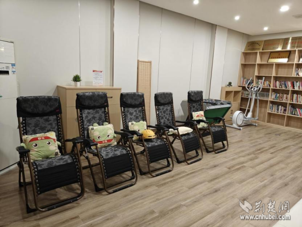 走進(jìn)這個(gè)330平方米的升級(jí)版驛站,變化隨處可見。這里不僅有基礎(chǔ)的微波爐、冰箱、沙發(fā)等,更添置了共享淋浴間、聽書機(jī)、直飲機(jī)、空調(diào)等。曾經(jīng)的后廳,如今被打造成一個(gè)多功能“潮玩空間”——午休時(shí)間,拉上窗簾,這里是配備了舒適躺椅的靜謐午睡室;工作之余,這里又變身為熱鬧的“社交俱樂部”,大家可以一起看電視、玩桌游,徹底放松身心。