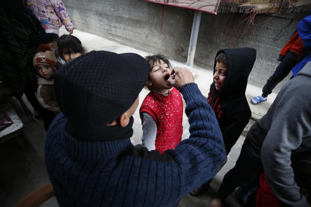2月22日,工作人員在加沙地帶杰巴利耶為巴勒斯坦兒童接種脊髓灰質炎疫苗。新華社發(fā)(馬哈茂德·扎基攝)