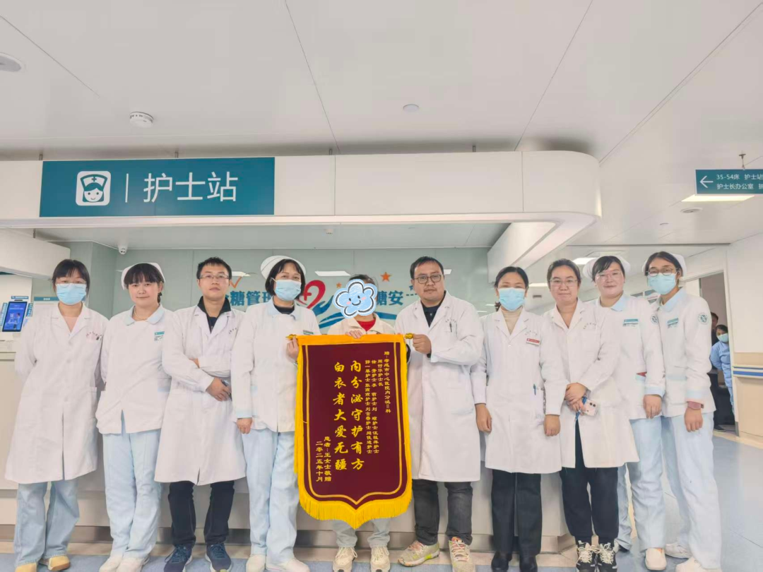 經(jīng)過20多天的治療與護理,王阿姨的各項身體指標逐漸恢復(fù)正常,從入院時需臥床到出院時可自行行走,精神狀態(tài)明顯好轉(zhuǎn)。近日復(fù)診時,她將提前準備的兩面錦旗送到內(nèi)分泌科II病區(qū),拉著周付華護士長的手說:“劉瓊、郭一菲、汪桂萍這些護士,工作特別負責(zé)。那個凌晨的照料,我一直記在心里。”