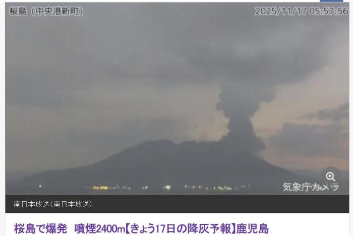 中新網(wǎng)11月17日電 據(jù)日本“南日本放送”援引日本氣象廳的消息,當(dāng)?shù)貢r間17日凌晨5時54分,日本櫻島南岳山頂火山口發(fā)生爆炸性噴發(fā)。