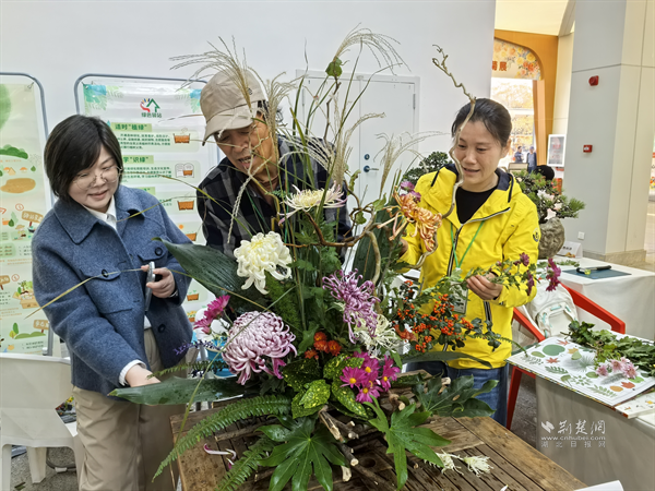 江岸區(qū)勞動(dòng)街道公園社區(qū)園藝師韋勝(中)現(xiàn)場演示菊花插花技藝。通訊員供圖