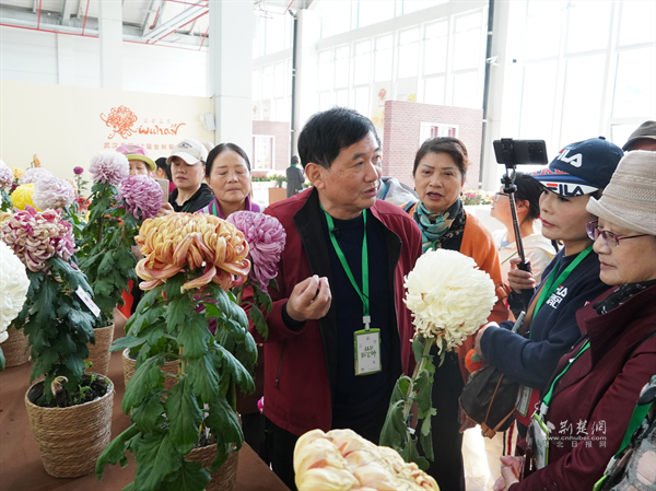 今年67歲的辛高爐擁有40多年菊花栽培經(jīng)驗(yàn),其培育的菊花品種與插花作品曾多次榮獲全國大獎(jiǎng)。他結(jié)合自己多年的養(yǎng)花心得,將菊花品種特性、造型技巧與養(yǎng)護(hù)要領(lǐng)娓娓道來,不僅吸引園藝師凝神傾聽,更引得沿途市民駐足圍觀。