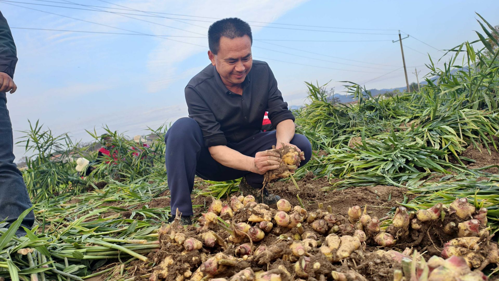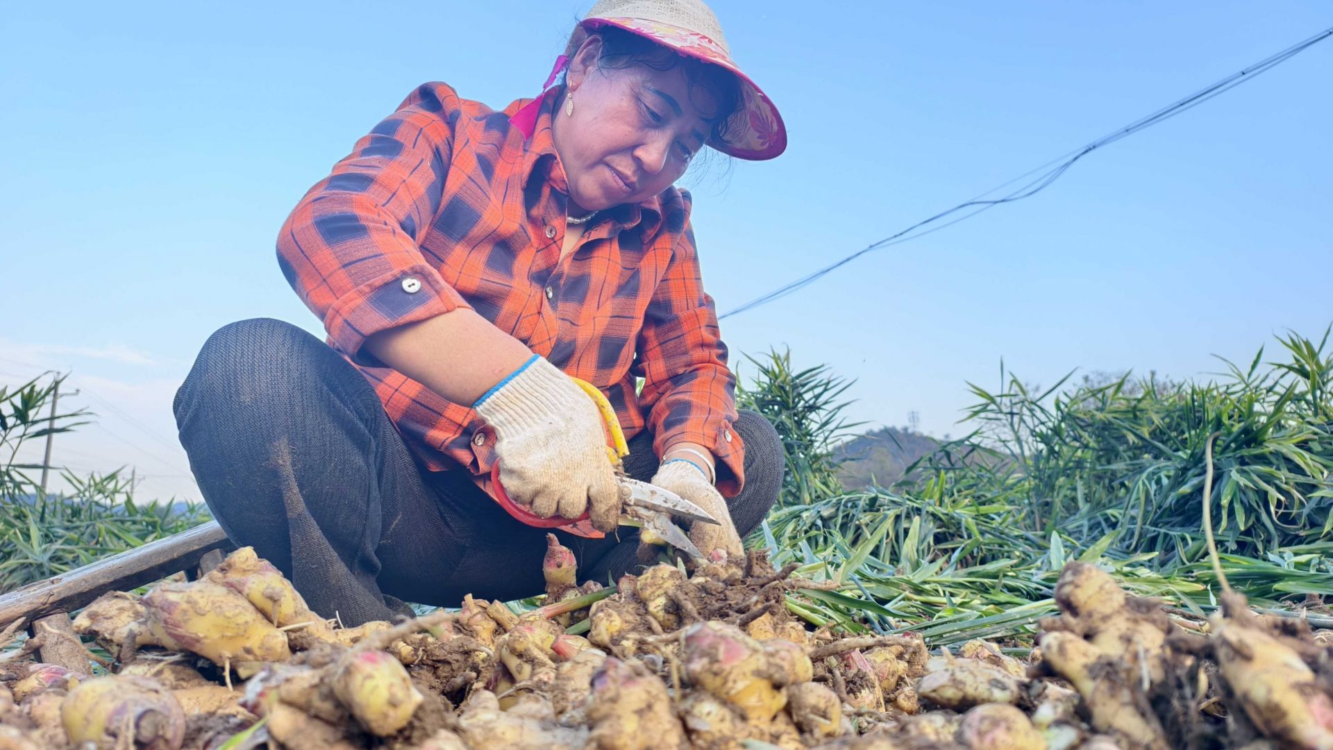 “這生姜個(gè)頭大、品相好,掰開(kāi)辛香味撲鼻,今年準(zhǔn)能賣個(gè)好價(jià)錢!”正在采收的村民臉上滿是喜悅,將新鮮生姜在身后整齊碼放。