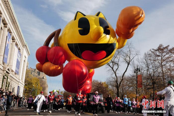 當?shù)貢r間11月27日,第99屆梅西百貨感恩節(jié)大游行在美國紐約舉行。圖為“吃豆人”巨型氣球首次亮相紐約感恩節(jié)大游行?!≈行律缬浾?王帆 攝