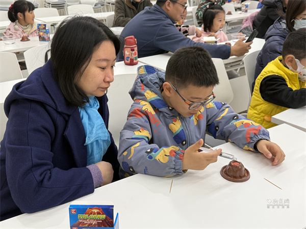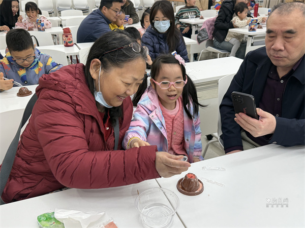 為讓抽象原理更直觀,活動(dòng)設(shè)置模擬火山噴發(fā)實(shí)驗(yàn)環(huán)節(jié)?,F(xiàn)場備好黏土火山模型、小蘇打、白醋等物料,容東林一邊操作一邊講解:向“巖漿腔”倒入小蘇打并加紅色素,再注入白醋,紅色“巖漿”瞬間噴涌而出,引得居民驚嘆、孩子們目不轉(zhuǎn)睛。他引導(dǎo)大家觀察全過程,深入淺出解釋酸堿反應(yīng)原理及火山灰對(duì)生態(tài)環(huán)境的影響,還邀請(qǐng)孩子們近距離體驗(yàn),激發(fā)科學(xué)探索興趣。
