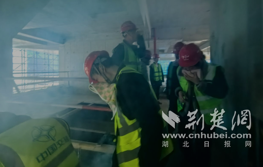 本次演練模擬施工現(xiàn)場突發(fā)火災(zāi)場景:火勢(shì)迅速蔓延,產(chǎn)生大量濃煙,威脅人員生命安全。項(xiàng)目綜合保障組在指定區(qū)域釋放煙霧,并廣播播報(bào)火災(zāi)警報(bào)。安全保衛(wèi)組人員立即到達(dá)該樓層、各通道關(guān)鍵位置,引導(dǎo)大家用濕毛巾捂住口鼻,低姿彎腰,按照預(yù)定疏散路線有序撤離。整個(gè)疏散過程耗時(shí)2分鐘,效率較高。