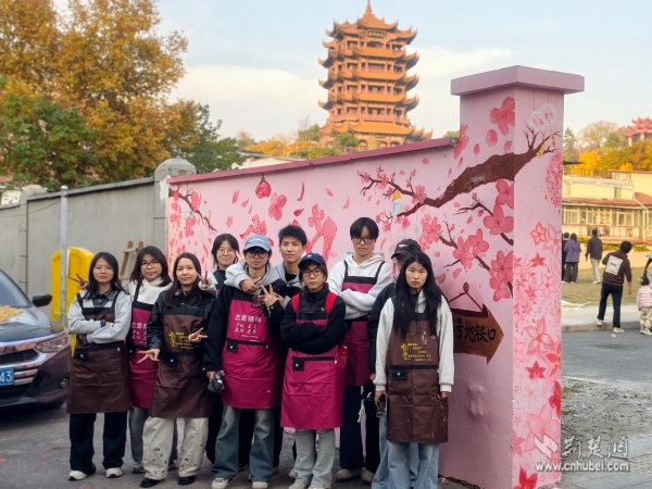 次日,創(chuàng)作進(jìn)入精修階段。志愿者們細(xì)致調(diào)整“武漢”字樣的色彩飽和度,用粉白顏料層層暈染出飛揚(yáng)的櫻花花瓣。四只形態(tài)各異的貓咪相依蹲坐,靈動(dòng)可愛;特意添加的“5號(hào)地鐵口”指引牌等實(shí)用元素,更讓作品兼具藝術(shù)性與功能性。創(chuàng)作過程中,不斷有居民和游客駐足觀賞,主動(dòng)詢問設(shè)計(jì)理念?!拔覀兿胪ㄟ^櫻花、貓咪等元素,展現(xiàn)武漢的浪漫與煙火氣。”志愿者一邊調(diào)色一邊向圍觀群眾講解。