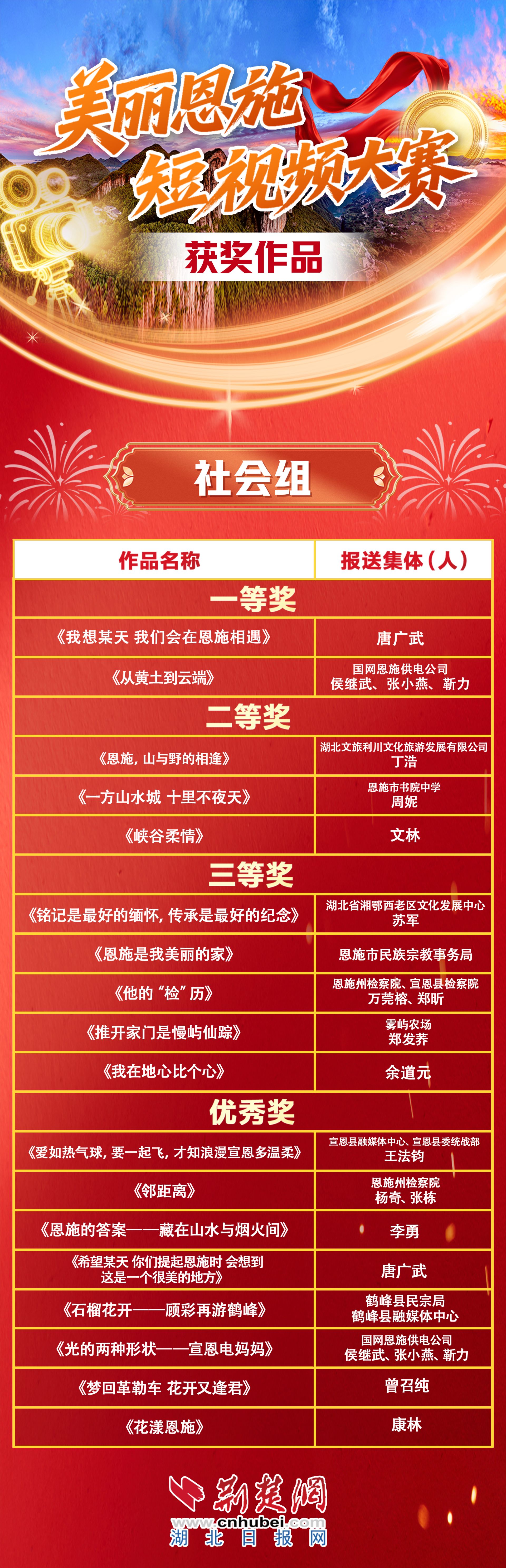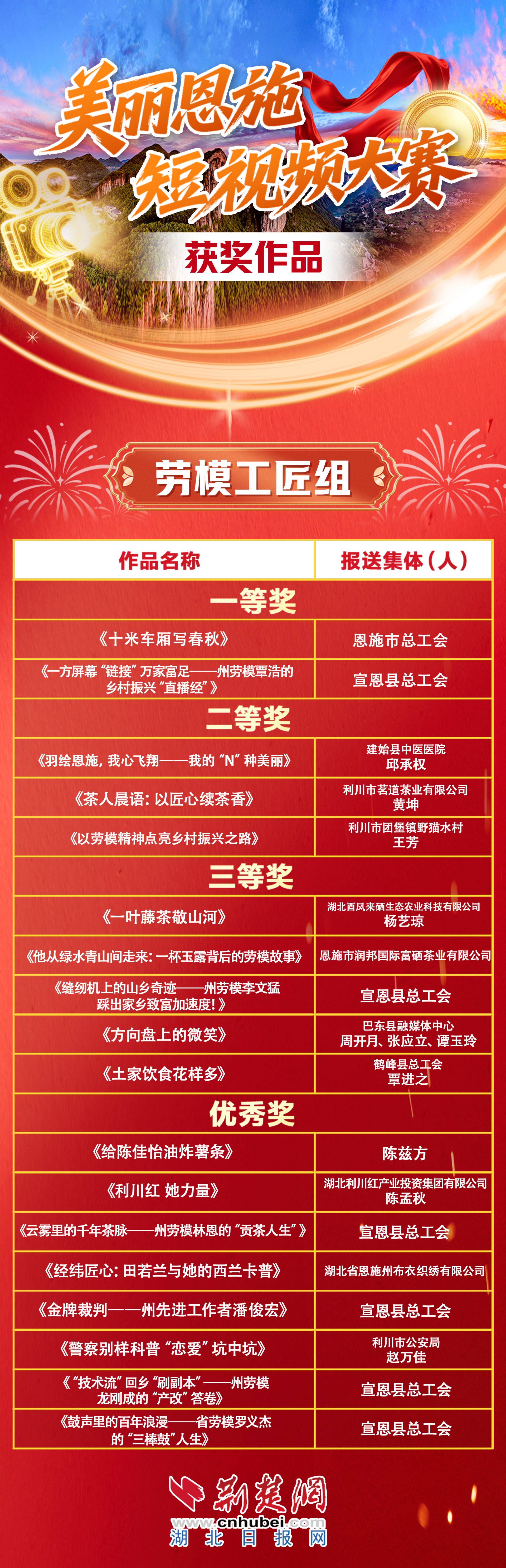 荊楚網(wǎng)(湖北日報網(wǎng))訊(記者楊寶 通訊員梁義雯)12月2日,由恩施州委統(tǒng)戰(zhàn)部、州總工會、團(tuán)州委、州民宗委聯(lián)合舉辦的“美麗恩施的‘N’種美麗”短視頻創(chuàng)作大賽評選結(jié)果揭曉,54部作品獲獎。