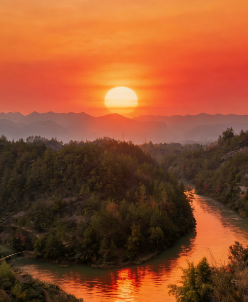 群峰在天際若隱若現(xiàn),東方顯出了魚肚白。不久,太陽露出來了,害羞的它只露出小小的、緋紅的額頭,天空也亮了起來。只過了一小會兒,太陽又自信了起來,又探出半邊臉,由緋紅變成橙紅,像一個剛出鍋的鵝蛋黃。天空變成了亮黃色,好像黃色的顏料盤被打翻了似的。