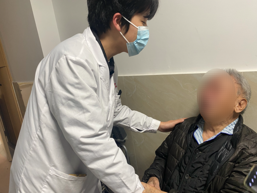 自那以后,每當(dāng)張子騰查房或從病房前經(jīng)過,陳爺爺?shù)哪抗饪倳o緊追隨著他。那天護(hù)理查房時,陳爺爺一看到張子騰,嘴唇便開始微微顫動,那雙閱盡近一個世紀(jì)滄桑的眼睛里,迅速蓄滿了淚水。