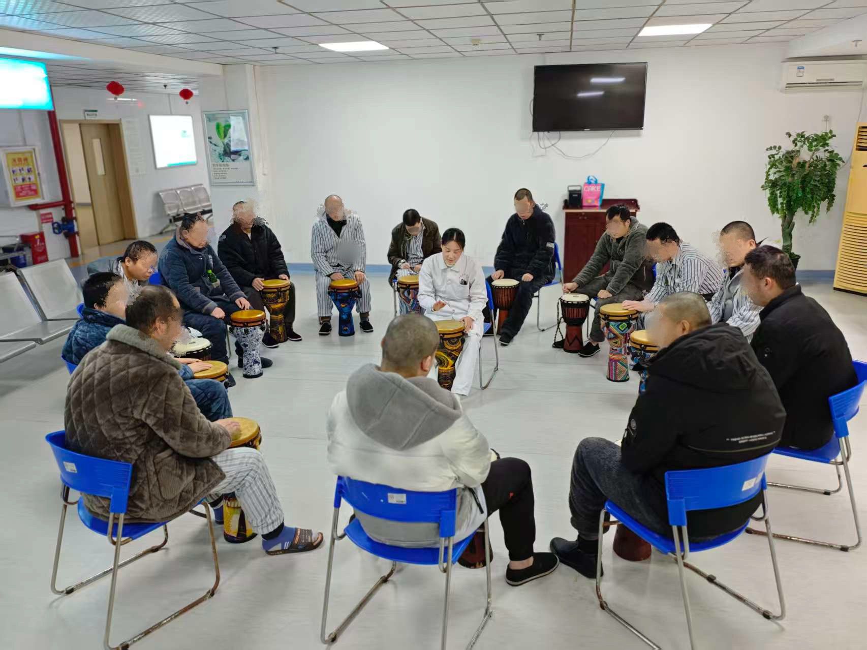 “鼓圈就像一個包容又充滿力量的‘聯(lián)結(jié)圈’,我在鼓點的共振中釋放了積壓的壓力,情緒也得到了有效舒緩。跟著治療師的動作節(jié)奏,心慢慢沉進當下的節(jié)拍里,真切體會到了‘同頻’的默契,特別踏實安心。” 一位患者在活動后真誠分享。這種沉浸式的參與體驗,能夠有效喚醒患者的內(nèi)在動力,助力他們在自主掌控的節(jié)奏中實現(xiàn)心理調(diào)適與社會功能修復?;颊邆冊谶@場節(jié)奏互動中,不僅感知到聽覺、觸覺、視覺的多維聯(lián)動,更在“即興創(chuàng)作”與“節(jié)奏共鳴”中,尋得情緒疏解的有效出口,自信心與自我認同感也得到了顯著提升。