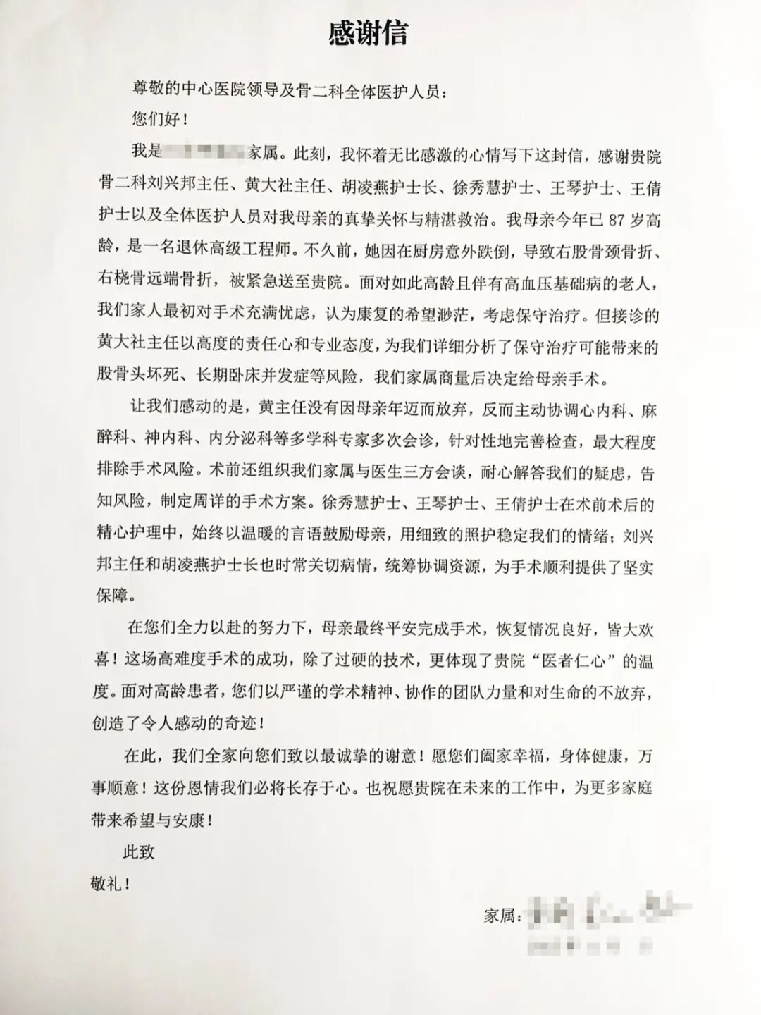 “是你們讓我的87歲老母親重新站了起來,更讓她在這里感受到家一般的溫暖,這份恩情我們?nèi)毅懹浻谛?!”近日,李奶奶(化名)在家人陪伴下,精神矍鑠地走出潛江市中心醫(yī)院。臨行前,家屬將一封情真意切的感謝信,鄭重交到醫(yī)護人員手中。