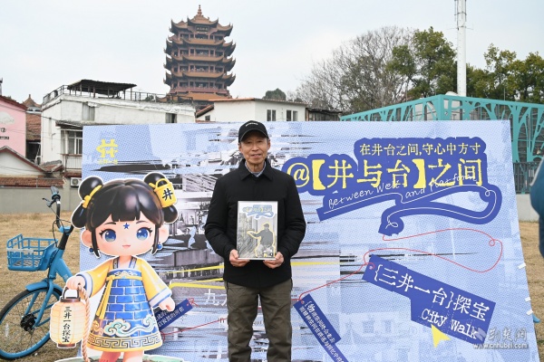 快閃活動選址社區(qū)黃鶴游園,抬頭即見巍巍黃鶴樓?,F(xiàn)場,82歲守井人謝邦純老人與社區(qū)工作人員、青年學子一同講述“三井一臺”的故事,帶領在場居民穿越時空,觸摸楚王府遺韻與市井生活記憶。