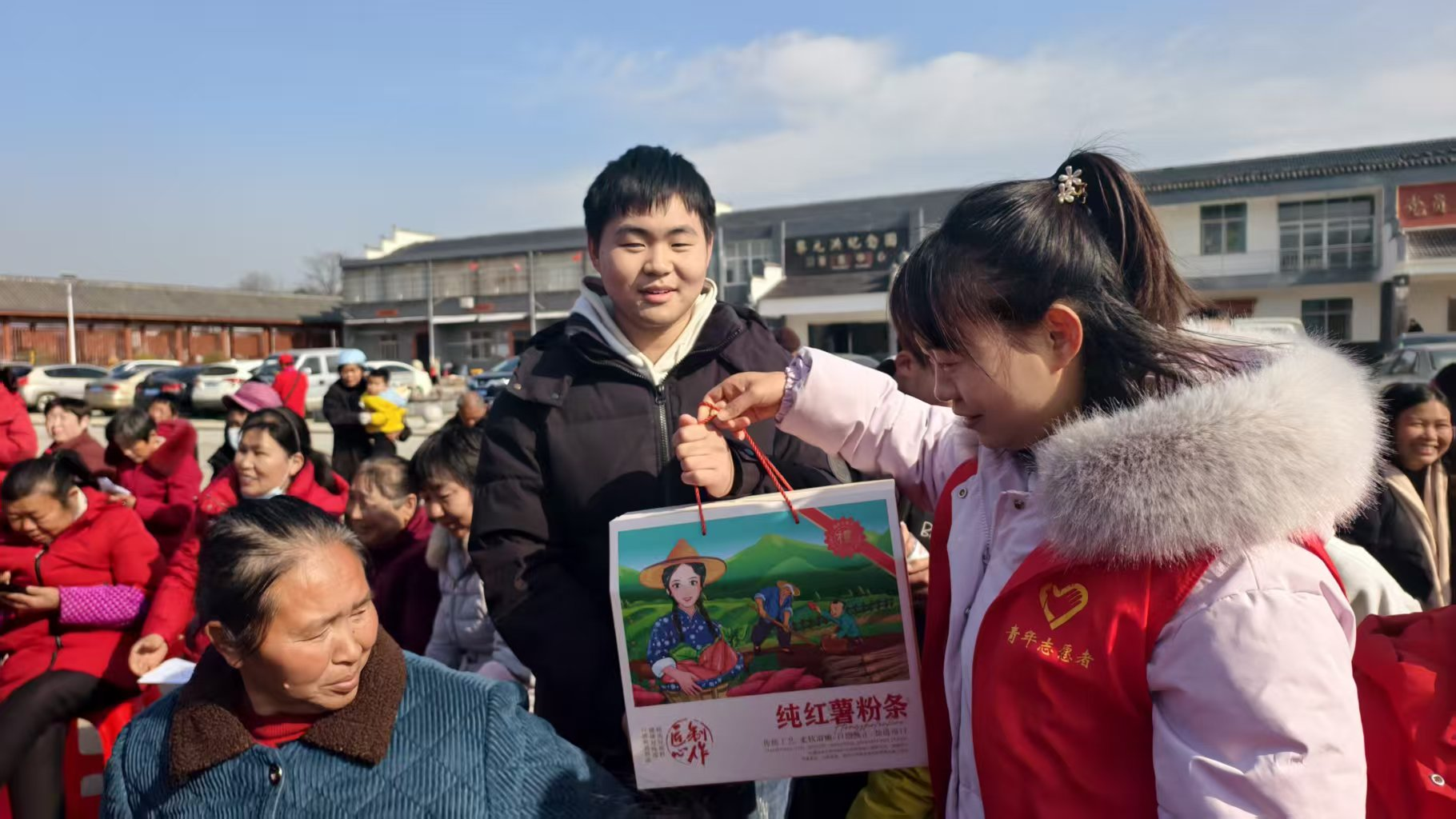 村晚中穿插貼近生活、關(guān)乎文明的知識(shí)有獎(jiǎng)問(wèn)答,引得臺(tái)下村民搶答,答對(duì)的村民不僅收獲了文明常識(shí),還贏得了一份份春聯(lián)和福字,或者本地特產(chǎn)“年貨大禮包”。