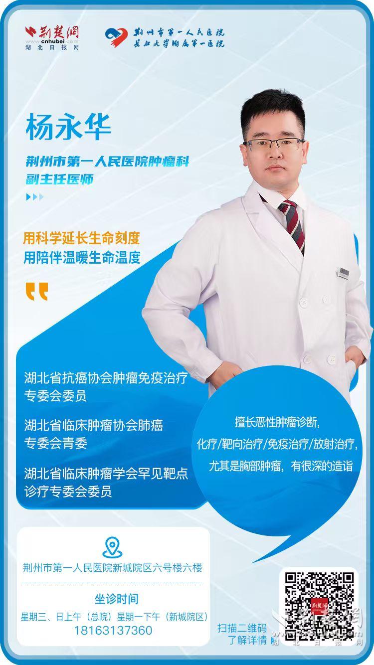 楊永華:副主任醫(yī)師,湖北省抗癌協(xié)會腫瘤免疫治療專委會委員,湖北省臨床腫瘤協(xié)會肺癌專委會青委,湖北省臨床腫瘤學(xué)會罕見靶點診療專委會委員,湖北省醫(yī)學(xué)會腫瘤分會肺癌組組員。