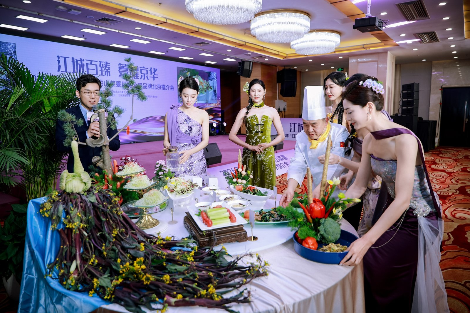 活動(dòng)現(xiàn)場,《千年一“薹”,京誠所愛》情景劇生動(dòng)詮釋洪山菜薹的傳承與創(chuàng)新,產(chǎn)品走秀與藝術(shù)插花表演凸顯其美學(xué)價(jià)值,楚菜名廚現(xiàn)場演繹“一薹多吃”宴席,展現(xiàn)菜薹融入京鄂風(fēng)味的烹飪創(chuàng)意。京城網(wǎng)紅大廚隋坡登臺(tái)品鑒,為洪山菜薹實(shí)力“打call”?,F(xiàn)場同步設(shè)置國風(fēng)市集,展出鮮薹、鎖鮮產(chǎn)品及禮盒,供嘉賓品鑒體驗(yàn)。