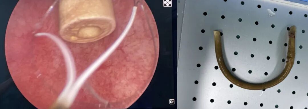 然而,在膀胱鏡檢查術(shù)中,醫(yī)生發(fā)現(xiàn)這根異物竟是半截被結(jié)石包裹的舊導尿管??紤]到激光破碎可能損傷膀胱黏膜,晏增亞當機立斷,決定調(diào)整手術(shù)方案。他與張佳晨醫(yī)生默契配合,利用簡易套索工具,精準套住異物一端,小心翼翼地調(diào)整角度,穩(wěn)步將這根潛藏多年的“陳年老物”完整取出。整個手術(shù)過程不到十分鐘,出血少、創(chuàng)傷小,既避免了器械破碎帶來的潛在損傷,又為患者大幅節(jié)約了治療費用。