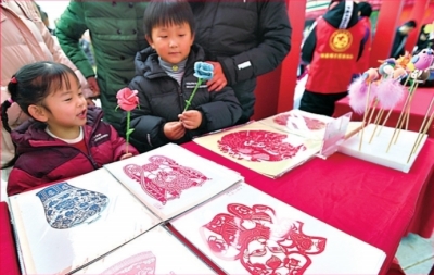 免費(fèi)領(lǐng)取新春剪紙后,小朋友迫不及待展示。