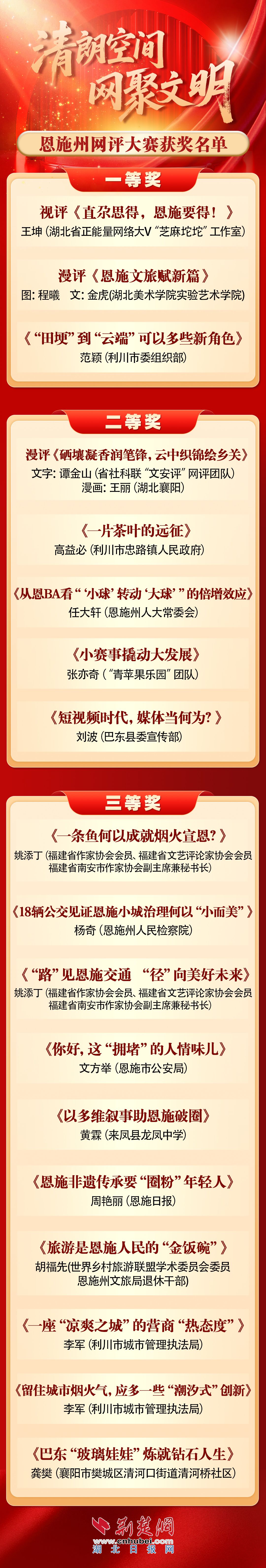 荊楚網(wǎng)(湖北日?qǐng)?bào)網(wǎng))訊(記者楊寶)2月11日,由中共恩施州委網(wǎng)信辦主辦,荊楚網(wǎng)(湖北日?qǐng)?bào)網(wǎng))承辦的“清朗空間 網(wǎng)聚文明”恩施州2025年度網(wǎng)評(píng)征文大賽決賽評(píng)選結(jié)果揭曉,18篇作品獲獎(jiǎng)。