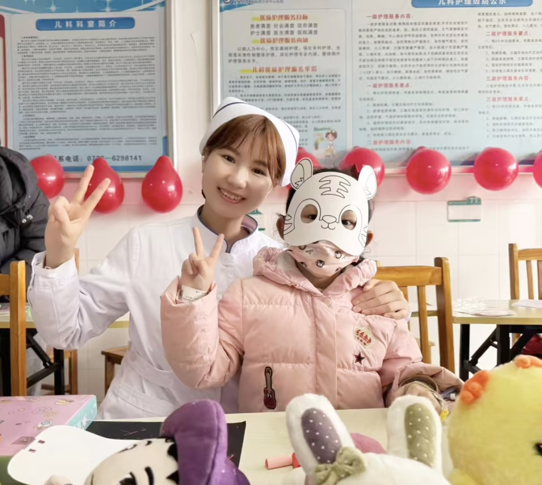 一位戴著老虎面具的小患者,緊緊拉著護(hù)士姐姐的手,比出“耶”的手勢,眼神里滿是歡喜。“孩子住院這么久,很少這么開心過,謝謝你們的用心?!焙⒆計寢尩脑捳Z里滿是感激。