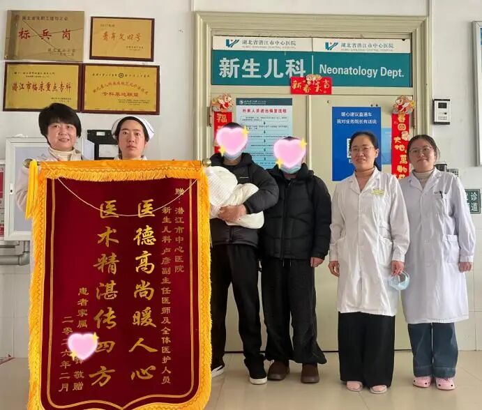 在新生兒科醫(yī)護(hù)團(tuán)隊的精細(xì)化治療與悉心護(hù)理下,寶寶接連闖過呼吸、喂養(yǎng)等難關(guān)。正月初八出院時,小家伙已能一次經(jīng)口完成35ml奶量,家長懷著感激之情送來一面鮮艷的錦旗。