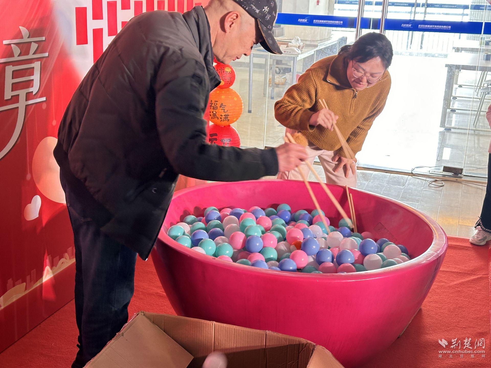 隨后,互動(dòng)環(huán)節(jié)正式開(kāi)啟。核心區(qū)域的巨型“團(tuán)圓碗”成為焦點(diǎn),碗中盛放象征團(tuán)圓的“元宵球”,員工們依次上場(chǎng),用長(zhǎng)筷在30秒內(nèi)夾取“元宵”,現(xiàn)場(chǎng)計(jì)數(shù)、排名,氣氛迅速升溫。