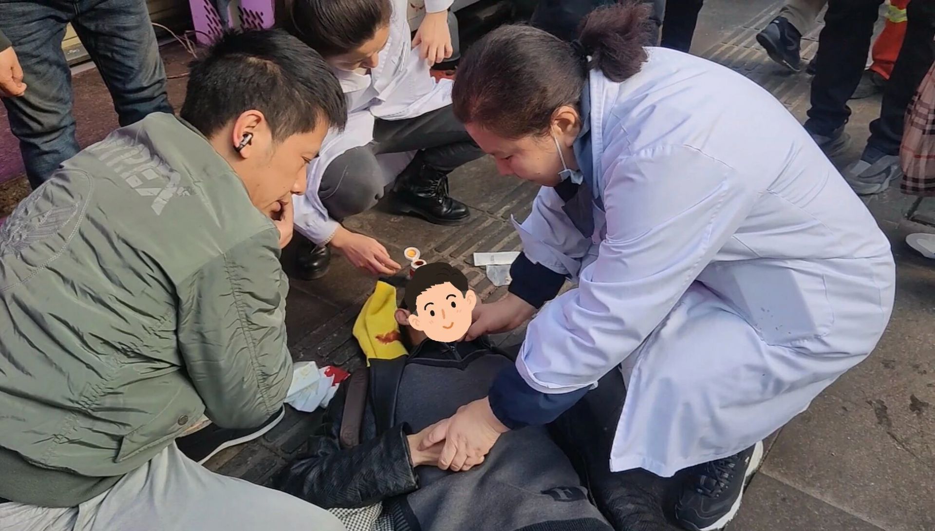 撥開圍觀人群,眼前的場景讓所有人的心揪緊了:一位老人仰面躺在一家店鋪門口,頭部下方已洇開一攤血跡,臉色蒼白,雙側(cè)瞳孔散大,意識喪失,旁邊圍著許多愛心人士。