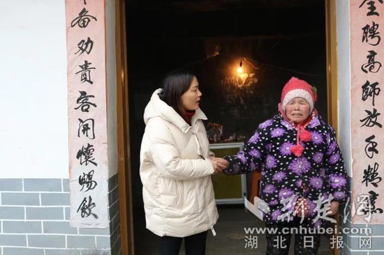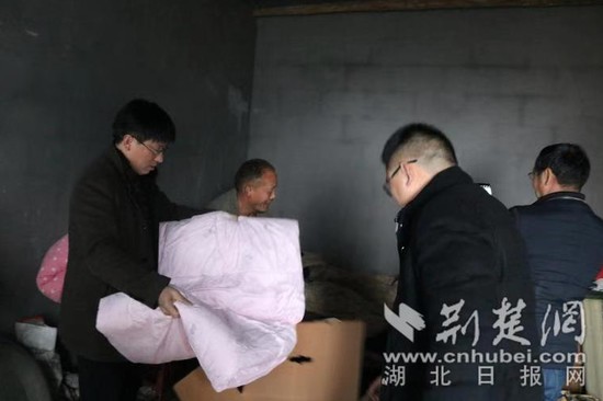 學(xué)校分管扶貧工作負(fù)責(zé)人為貧困戶宋祥銀送去棉被。通訊員謝圣斌 攝