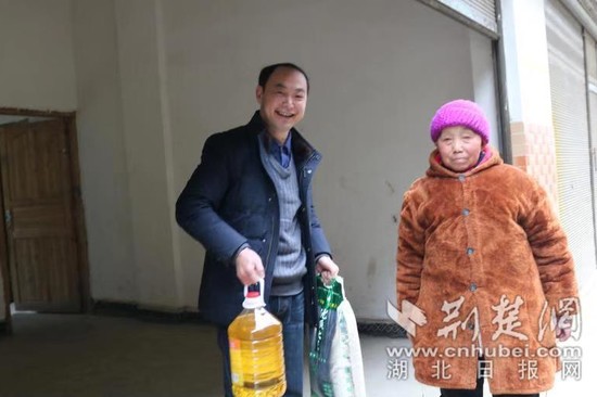 學(xué)校扶貧工作領(lǐng)導(dǎo)小組成員為幫困戶閆勝谷家送去大米和食用油。通訊員謝圣斌 攝