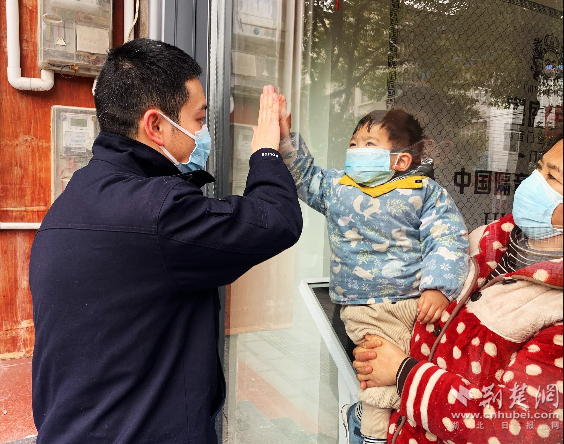 民警與2歲兒子隔窗擊掌。通訊員 供圖