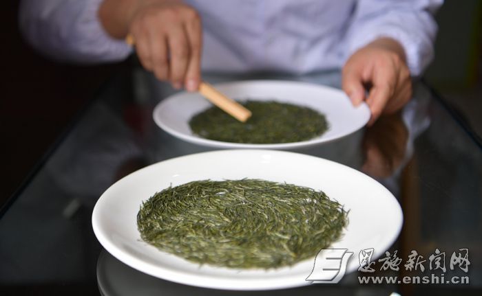 恩施玉露是一種以蒸汽殺青的綠茶,因茶香鮮爽口,外形條索緊圓光滑,色澤蒼翠綠潤,毫白如玉而得名(圖二),在茶葉市場頗受消費(fèi)者青睞。手工制作恩施玉露時,采用一芽一葉、大小均勻的鮮葉為原料,其制作過程分為蒸汽殺青(圖三)、攤涼、揉捻、整形上光、烘焙、揀選等工藝。2014年,恩施玉露制作技藝入選國家級非物質(zhì)文化遺產(chǎn)代表性項(xiàng)目名錄。 近年來,恩施市依托當(dāng)?shù)刎S富的茶葉資源,大力培養(yǎng)恩施玉露工藝傳人,使這一傳統(tǒng)手工茶煥發(fā)了活力。(記者 楊順丕 攝影報(bào)道)