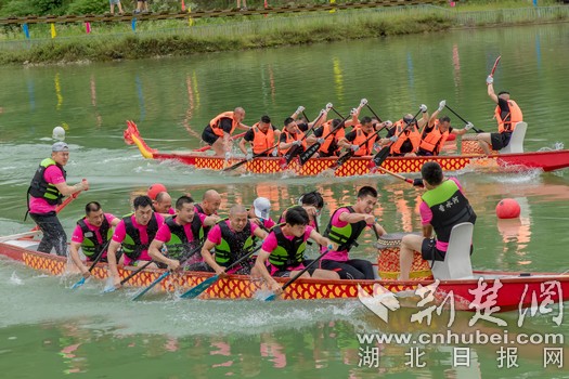 當(dāng)天,龍舟賽在歌曲《我和我的祖國(guó)》中拉開序幕,《鹽茶古道情景演出》《風(fēng)情龍馬》、舞獅等節(jié)目輪番上演,茶藝師們進(jìn)行茶藝表演。賽道上,來(lái)自湖南、襄陽(yáng)、十堰等地的12支代表隊(duì)在全長(zhǎng)200米賽道上展開激烈角逐。擊鼓、揮槳、爭(zhēng)渡……一艘艘龍舟劈波斬浪、奮勇爭(zhēng)先,岸上觀眾更是熱情高漲,吶喊助威,現(xiàn)場(chǎng)匯成一片歡樂(lè)的海洋。