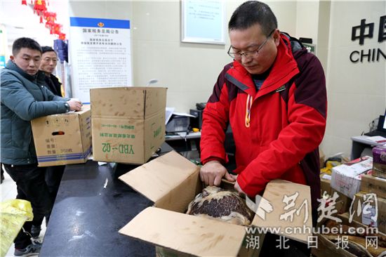 當(dāng)天,為讓在外地上班不能回家過(guò)年的兒女過(guò)年吃上“家鄉(xiāng)味道”,家住建始縣紅巖寺鎮(zhèn)崔家坡村67歲的黃國(guó)恩,來(lái)到紅巖寺郵政支局,將豬頭、豬蹄、香腸等180多斤土特產(chǎn)分別寄到武漢和南昌。營(yíng)業(yè)員依次分類(lèi),發(fā)往各地網(wǎng)點(diǎn)。