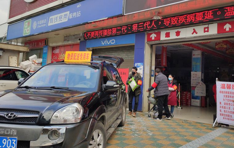 2月8日,崔家壩鎮(zhèn)的物資配送協(xié)調(diào)員正在超市采買物資。