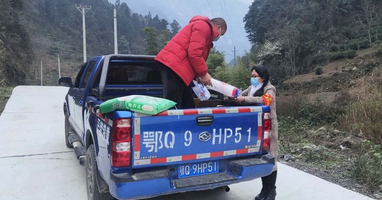 3月1日,防疫護衛(wèi)隊成員周興龍和吳曉玲在頭茶園村李爸溝組清點物資,為村民送貨上門。
