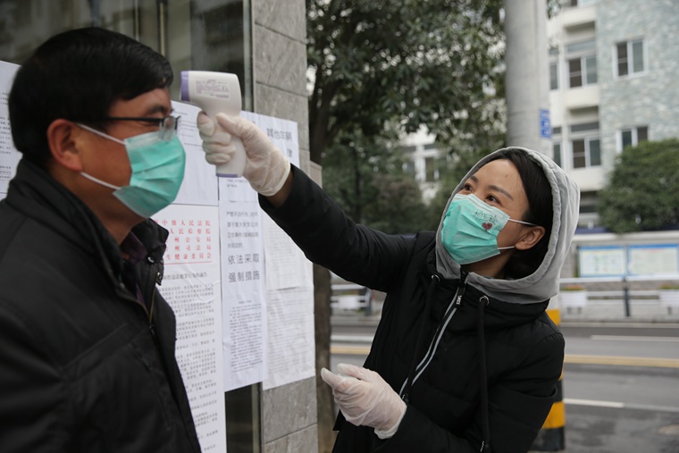市稅務(wù)局干部胡蘭玲在辦公區(qū)執(zhí)勤點(diǎn)為進(jìn)出人員測(cè)量體溫(汪曉暹 攝)