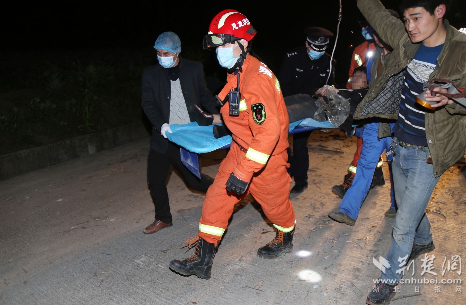 “師傅,不要緊張,我們馬上救你出來。你試一試,腿能動嗎?”夜晚的山區(qū)氣溫較低,被困司機(jī)情緒比較激動,消防救援人員不停的安撫被困司機(jī)情緒,并由現(xiàn)場醫(yī)護(hù)人員對被困司機(jī)進(jìn)行初步救治。
