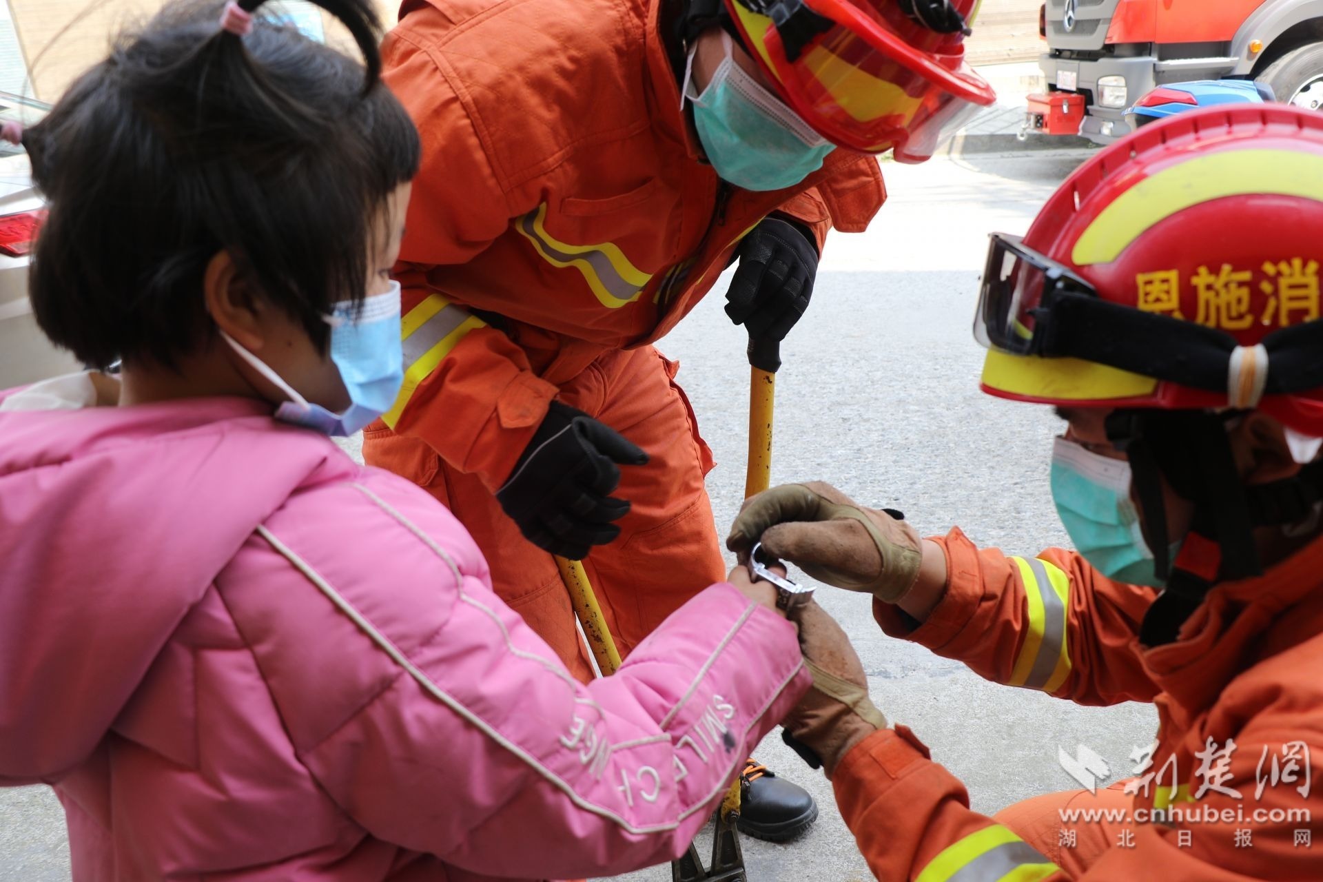 消防人員幫小女孩取“魔戒”。(通訊員 供圖)