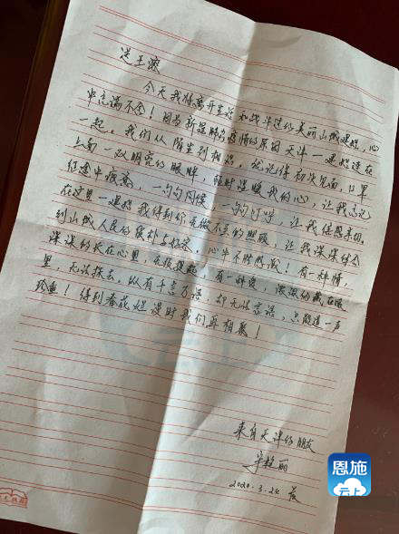 “一句句問候,一句句叮嚀,讓我倍感親切。在建始,得到你無微不至的照顧,讓我深深體會到山城人民的質(zhì)樸與好客......”3月24日,天津援助建始醫(yī)療隊踏上了回家的征程。臨走時,建始縣機(jī)關(guān)事務(wù)服務(wù)中心的工作人員王溶,收到了來自天津醫(yī)療隊的一封特別的信。