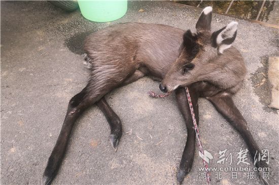 4月7日下午2時許,建始縣公安局紅巖派出所輔警黃國芳在里三坦村開展“一村一警”走訪摸排工作時,接到村民萬明山的電話,稱家中有只受傷的野生動物。他趕往老萬家中,看見樓梯間躺著一只體長約80厘米、重約30斤的野生青麂,盡管身體無明顯外傷,但兩只后腿拖在地上,初步判斷腿部骨折。
