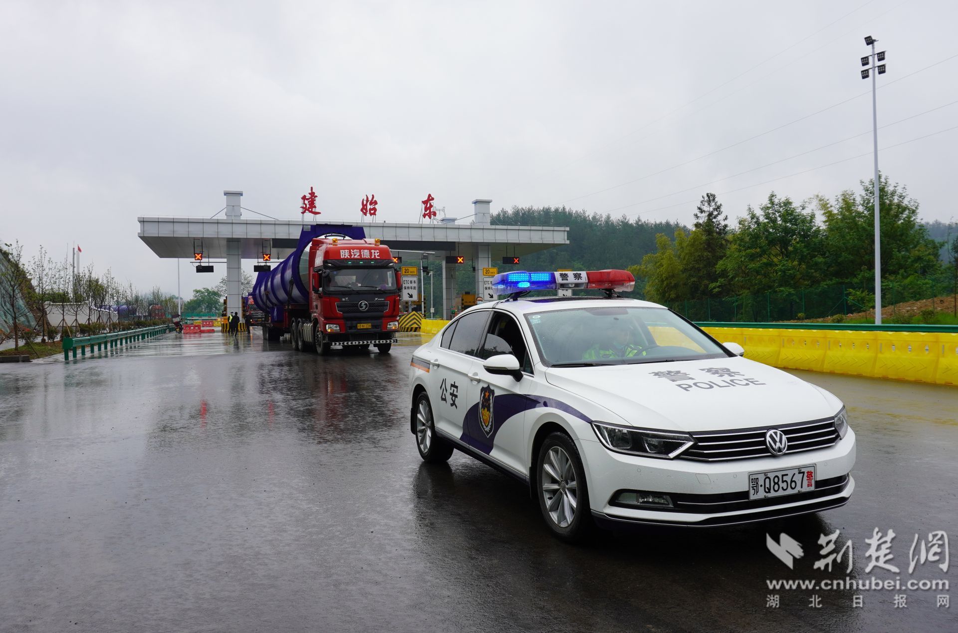 建始高警、交警經過精心籌劃、實地踏勘,將車隊進入建始后的運輸路線設置為,從建始東收費站經業(yè)紅公路弓箭巖路段進入建始城區(qū),再由煙墩大道、建始大道、209國道到達固泰建材公司廠區(qū)。9時50分,車隊緩慢駛出建始東收費站,已在出口外迎候多時的交警大隊警車立即接手引導任務,高警大隊警車也緊隨后方護送。