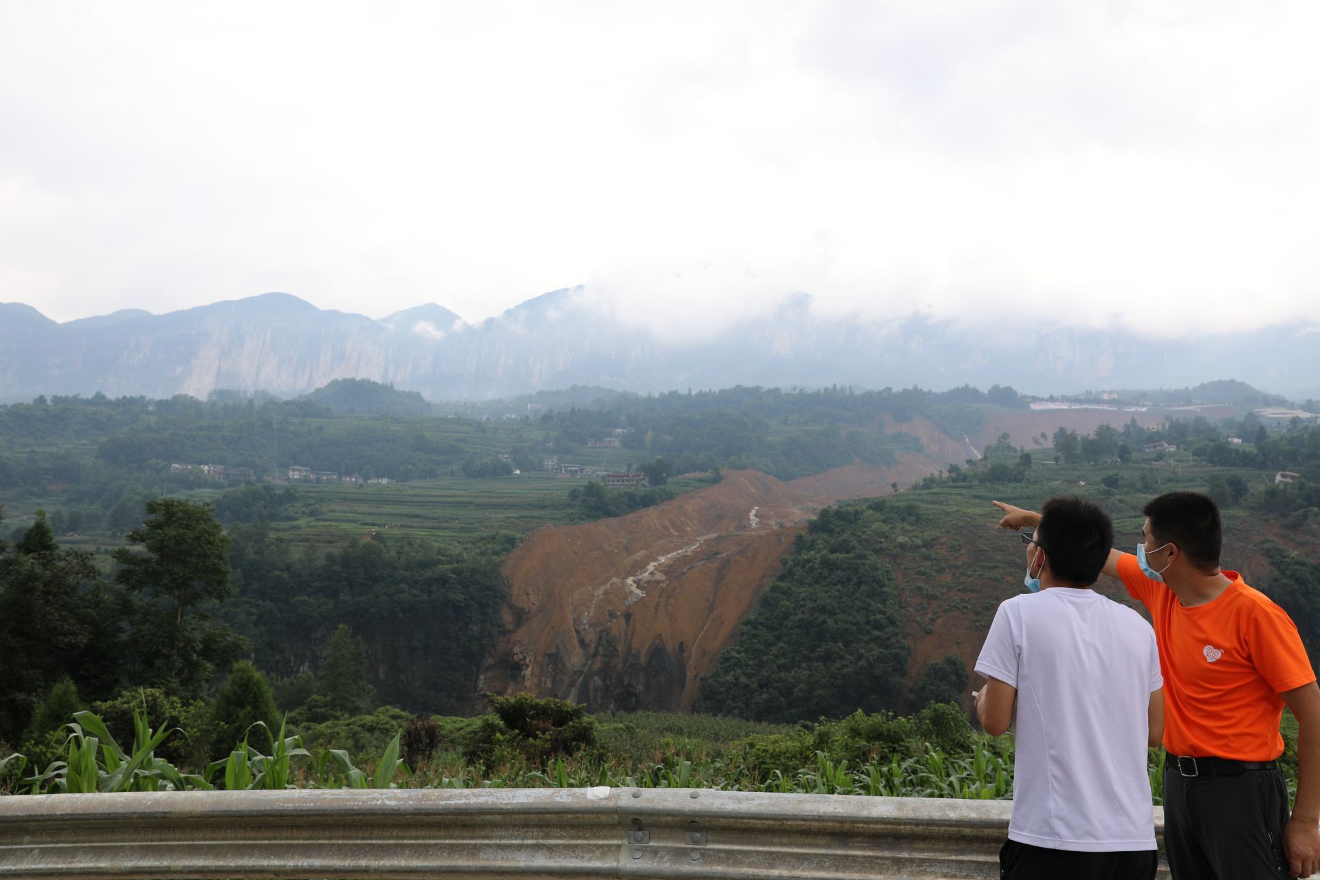 沿著318國道來到朝東巖附近,從一條小路進入田鳳坪村,腳下就是清江河谷,對面的馬者村滑坡帶清晰可見,大片山體滑坡留下黃色的缺口。山中還有少量來水,順著泥土砂石邊緣流入清江。步行而下,來到清江上游的小橋邊,下游數(shù)十米處泥沙還堆積在河床上,堰塞湖淹沒了原本岸邊的樹木,水位已下降很多。